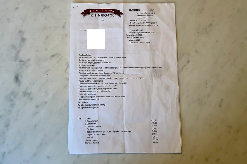 The work included fitting a reconditioned, correct-specification engine and a full respray in white, which makes an understated and classy alternative to the more common red. Since acquiring the car it has been used regularly and maintained to the sort of level you would expect of an enthusiast and Singer Club member. Significant work was undertaken in 2017 and 2018 which is shown in photos. Recent highlights have included a carburettor overhaul, speedometer repair, new fuel pump and other general servicing and repairs. The history file documents these and is shown in the photos.