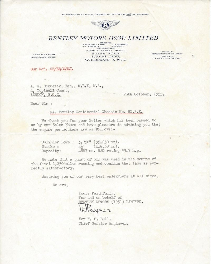 The ownership history is equally compelling. First registered in 1955 to Major Aubrey William Schuster MBE of the Moor Park Estate in Rickmansworth, the car remained with him for 26 years. When his health began to fail in 1981, he sold it to his neighbour's son, the very same young man he had taken for a ride in the car years earlier. That family then kept the Continental for another 27 years until 2008, with just two further custodians since. The history file contains the original buff logbook from 1955, the sales invoice from new, and a letter from the first owner expressing his desire to find an appropriate caretaker for his beloved Bentley.