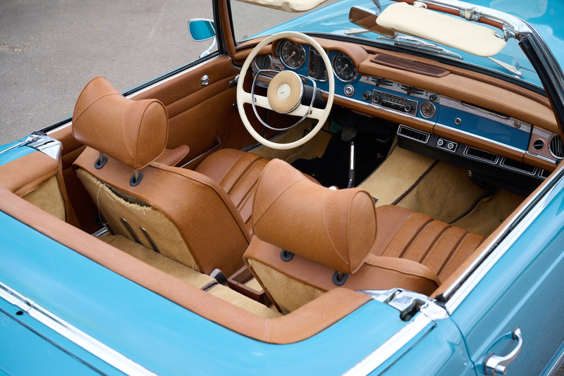 This 230SL Automatic arrived in the UK in 2018 and with the current keeper in 2022. He has carefully dry stored it before treating it to a full respray and retrim just prior to sale. Now finished in the appealing combination of ‘petrol blue’ over ‘tobacco’ tan, it is in very good cosmetic condition. The vendor also tells us that it is in good mechanical order and has been used sparingly for weekend runs.