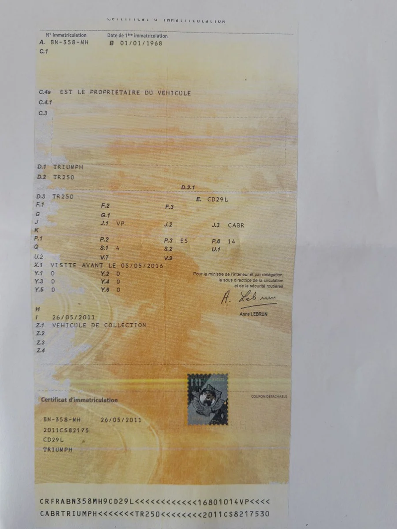 Complete with Contrôle Technique until 22nd December 2026, we're informed that this TR250 is in good running order. As the photographs attest, it is in very good condition, showing minimal signs of wear and tear, besides a light patina commensurate with age.image.png1.35 MB