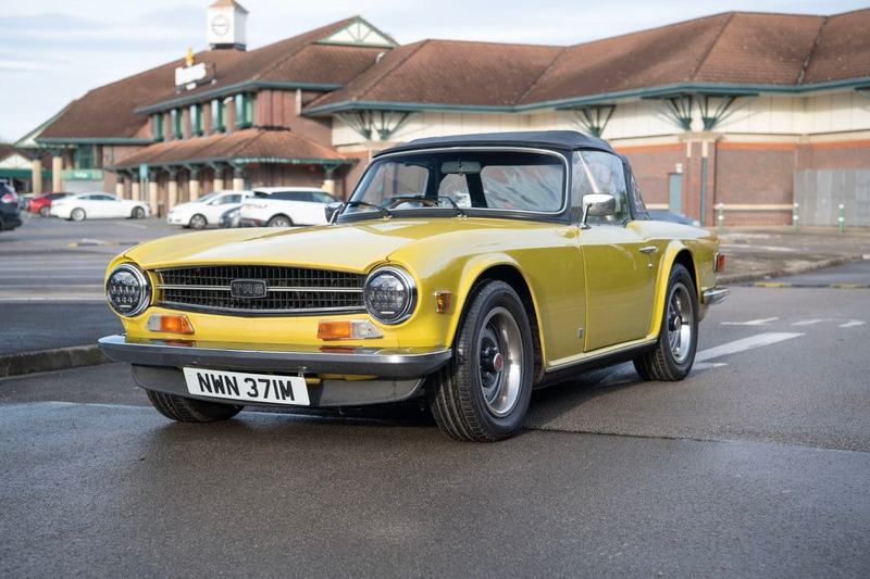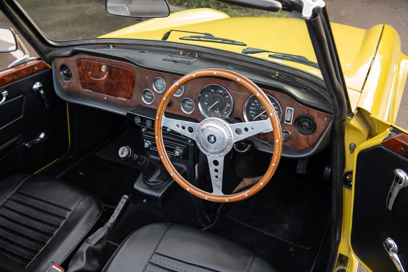 This Mimosa Yellow 1973 fuel-injected RHD UK-market car is a proper eye-catcher. It is a desirable ‘overdrive’ gearbox car that we’re told has been comprehensively restored, as evidenced by the photos. It presents well in the usual TR6 check areas, including door shut lines, sills and chassis. It retains its classic factory deep-dish steel wheels and PI system but features some useful upgrades such as walnut veneer dashboard and doors, upgraded headlights, DAB stereo and, most notably, power steering. As anyone who’s driven one will attest, that final addition considerably improves the TR6’s drivability. The cooling system has been improved with a Kenlowe fan.
