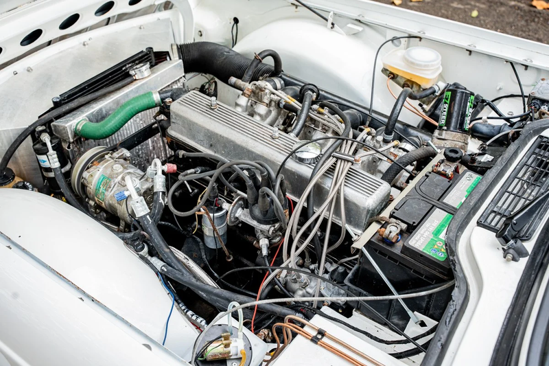 Finished in white and with Minilite-style wheels, it is a factory overdrive model, which makes long distance, high speed trips far easier. Further improving the drivability are electric power steering and what the vendor describes as ‘vintage air conditioning.’ Comfortable MX5 seats with built in speakers are currently fitted, but the original seats are included.