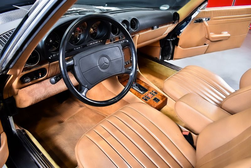 This 1986 example is presented in the classic combination of Black exterior with Palomino leather interior and dark blue soft top, a sophisticated pairing that showcases the model's elegant lines.