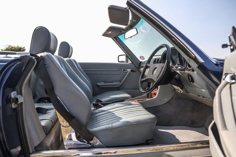 Nestling into its factory leather seating, this R107 feels like a timewarp. From the subtle wood trims to the colour-coded door cards, the astonishing interior of this car feels like it could have just left the showroom: there are virtually no giveaways of the car’s age, a testament to a lifetime of careful, diligent ownership. It's clear from first glance that this has been the pride and joy of every driver to sit in its opulent cabin. The car was photographed on a hot summers day and the original air conditioning was in full use and very welcome.