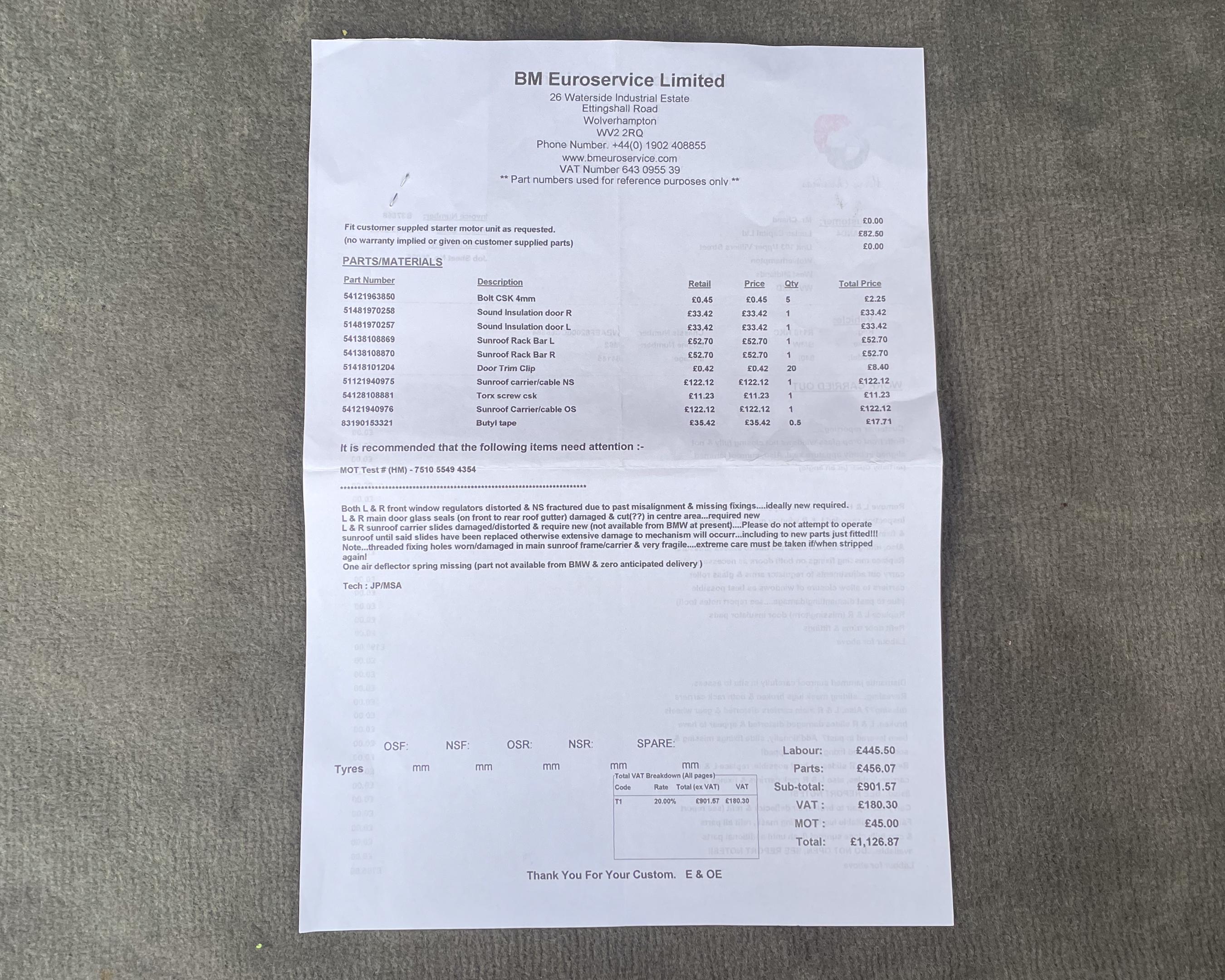 • £1,126 recently spent on electrics, sunroof and seals with specialist