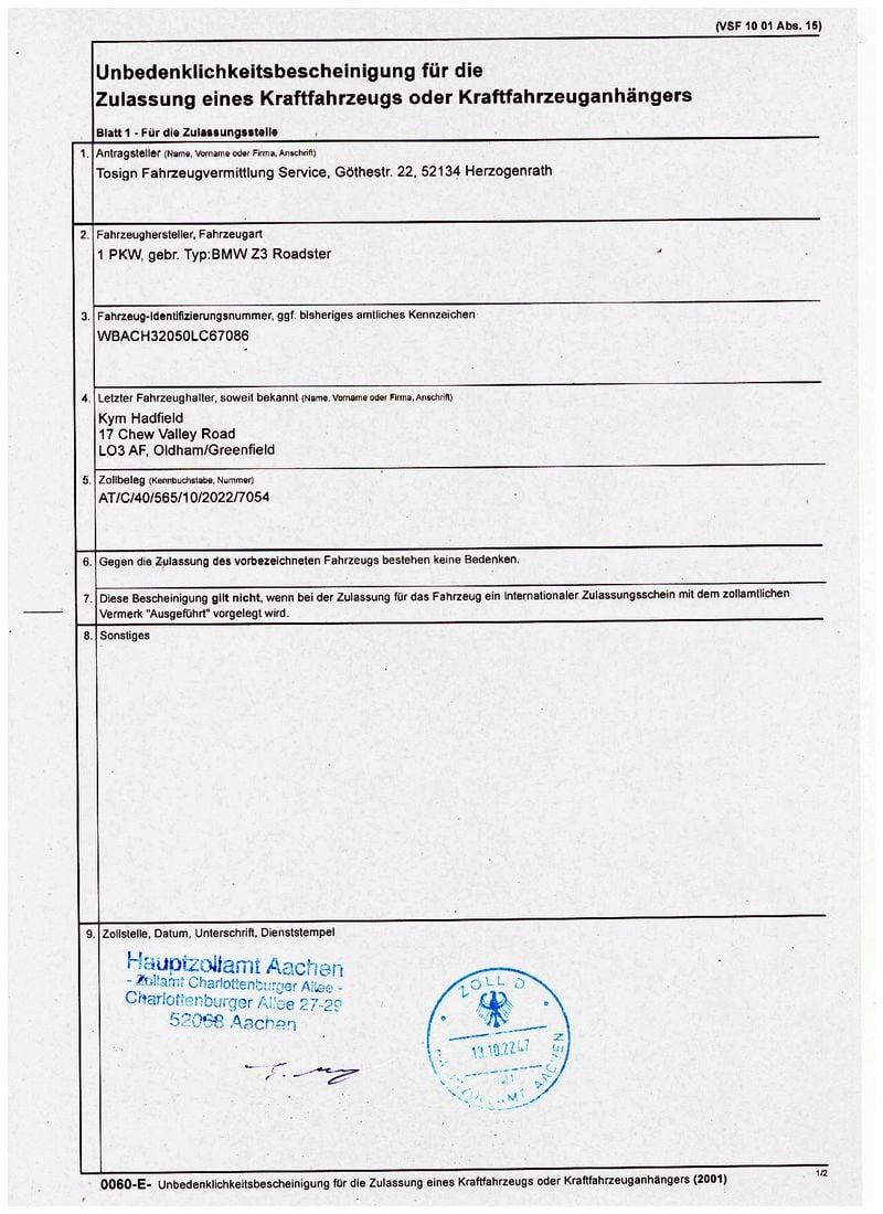 - UK-registered vehicle with V5, COC and customs clearance documentation