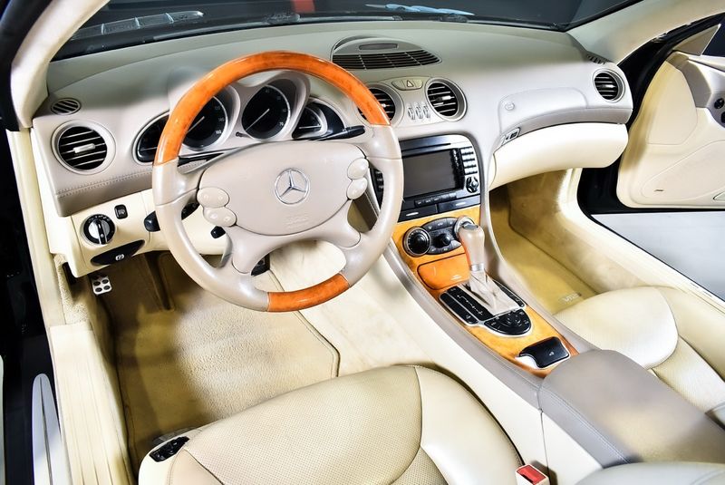 The Mercedes-Benz SL600 represents the pinnacle of the R230 SL lineup, with a formidable twin-turbocharged V12 engine that delivers an impressive 493 horsepower. This particular example from 2005 is finished in the timeless combination of Obsidian Black exterior with an Exclusive Beige leather interior, complemented by a burred walnut veneer trim throughout the cabin.
