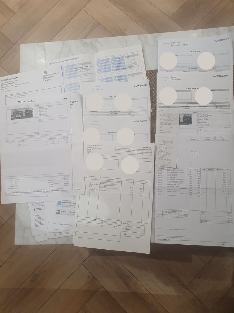 • Recent invoices showing comprehensive front suspension replacement with genuine BMW parts