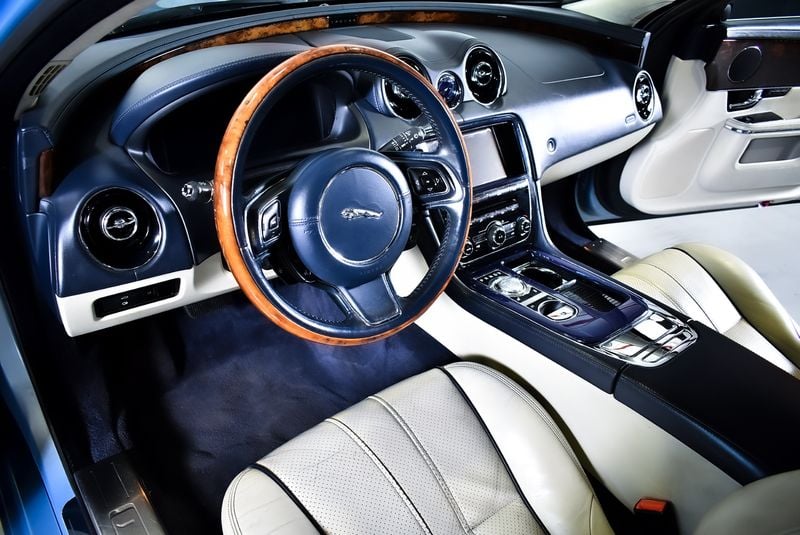 This 2011 example is finished in the rarely seen JJZ Frost Blue Metallic, a color that complements the XJL’s flowing lines especially well. The specification includes 20-way heated and cooled front seats with massage and memory, heated and cooled rear seats, figured ebony veneer trim, a panoramic glass roof, rear business trays, adaptive dynamics, self-leveling rear air suspension, and a 600W Jaguar audio system, among many other features detailed in the accompanying window sticker.