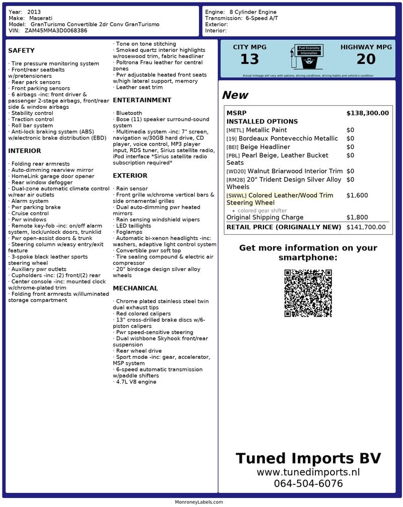 The car is offered with its USA title and Dutch import documentation, and EU duties and VAT have been settled. The car's window sticker is included, confirming its specification and its original retail price of $141,700.GranCabrio (9).jpg1.69 MB